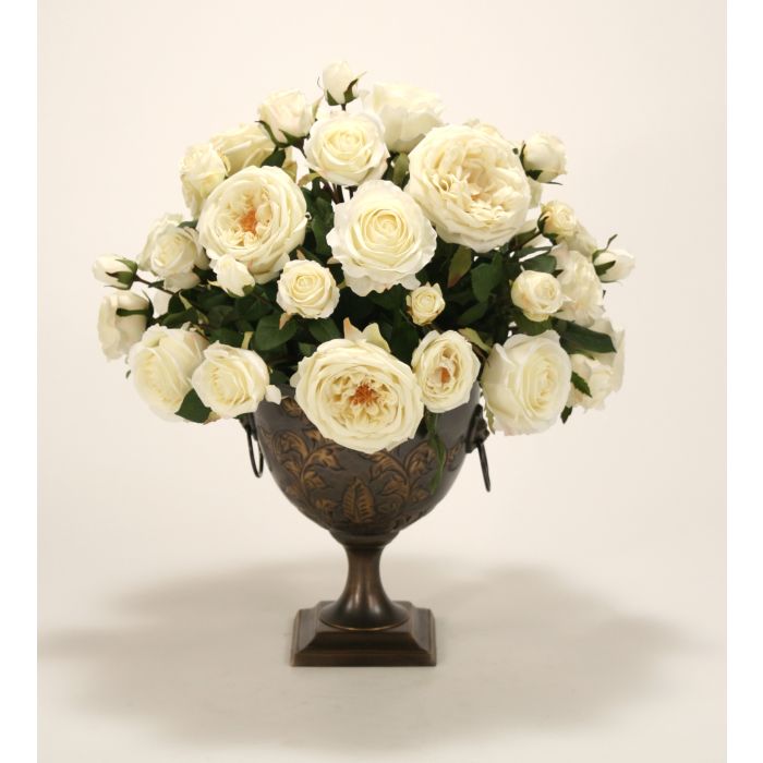 Luxury artificial Cream White, Ivory Roses in Bronze Compote.