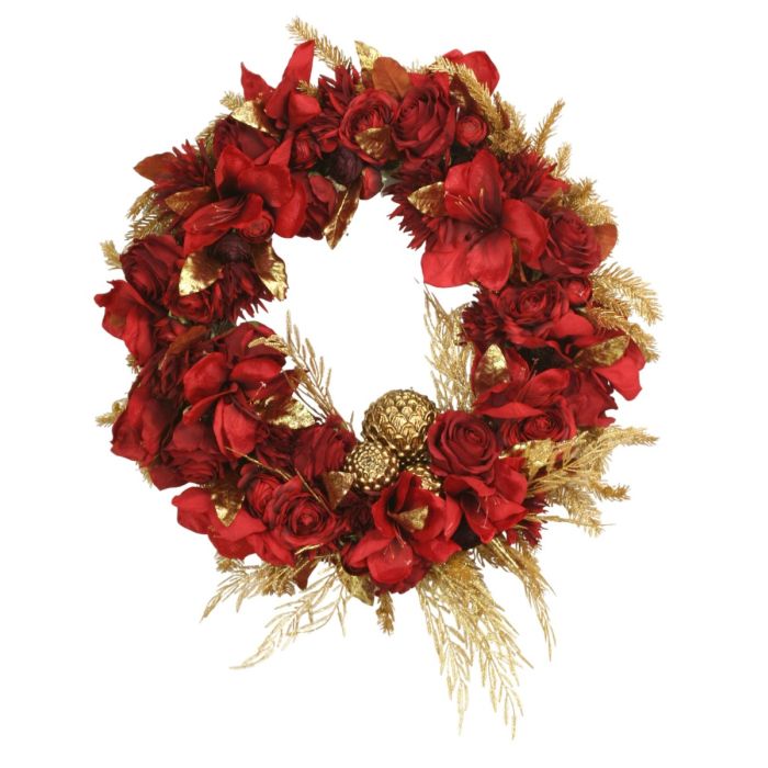Luxury artificial Amaryllis Wreath with Gold Ornaments and Gold Accents. Item ships fully assembled and arrives as shown.