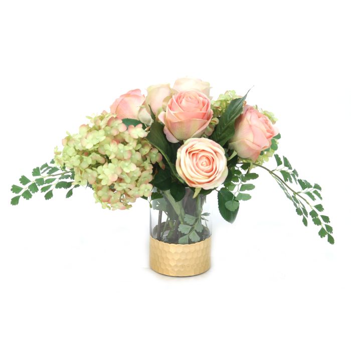 Luxury artificial Green Rose Hydrangeas and Pink Champagne Roses with Maiden Hair Fern in Glass Cylinder Vase with Gold Rimmed Base.